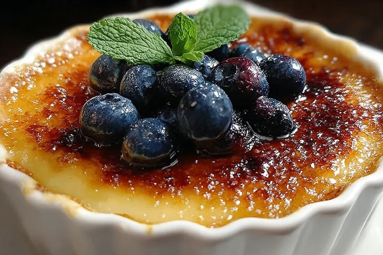 A creamy, elegant dessert featuring fresh blueberries and a crisp caramelized sugar top.