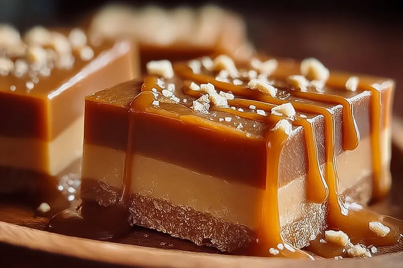 - Drizzle half of the caramel sauce over the fudge layer, then pour the remaining fudge mixture on top, smoothing the surface.