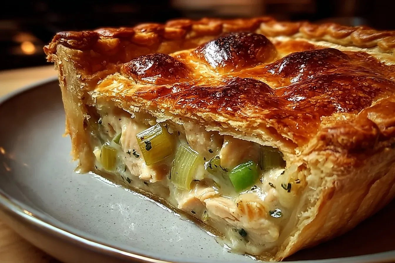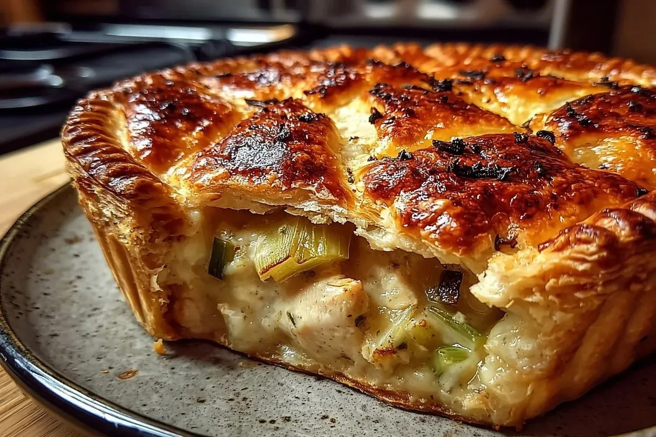 A comforting and savory pie with tender chicken and sweet leeks, wrapped in a flaky crust.