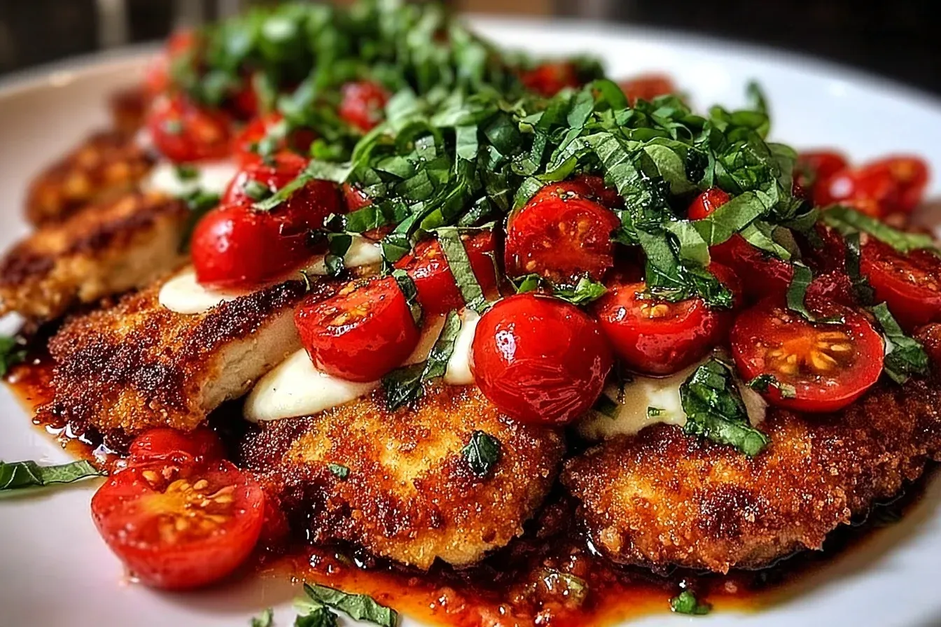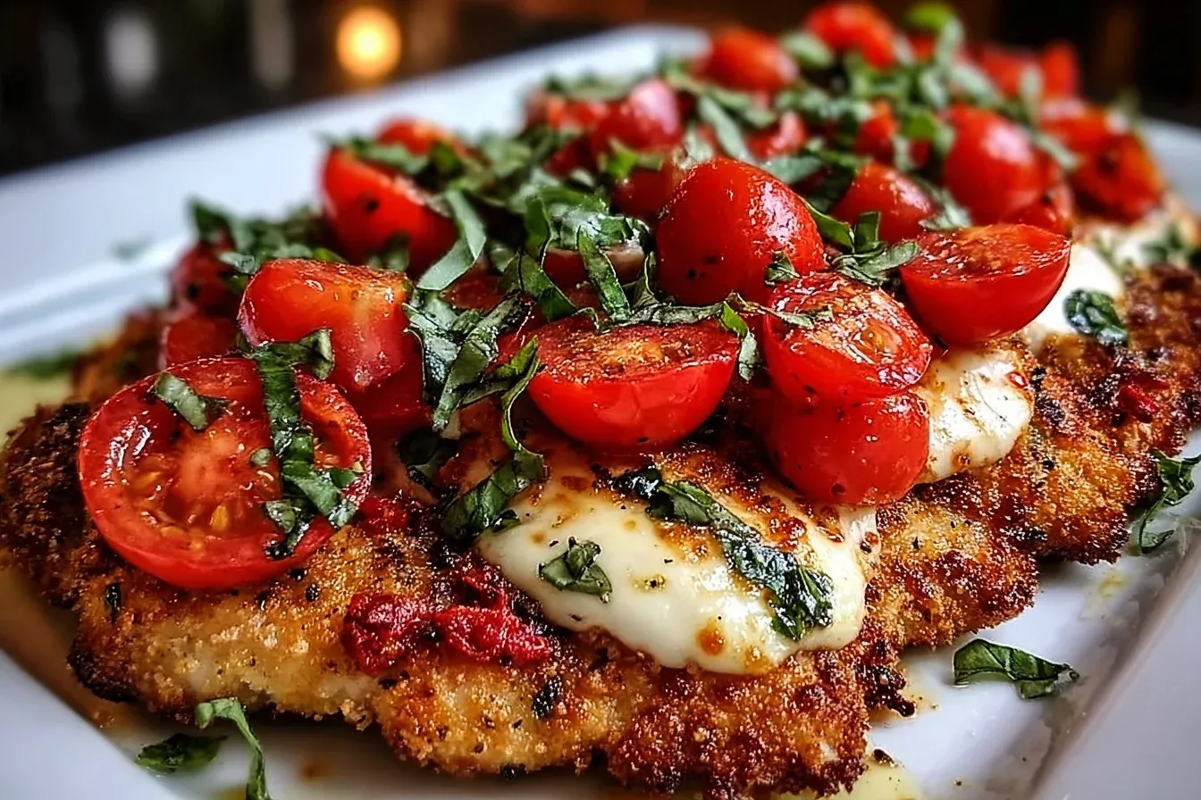 A delightful combination of crispy chicken topped with fresh tomato and mozzarella, perfect for a comforting dinner.