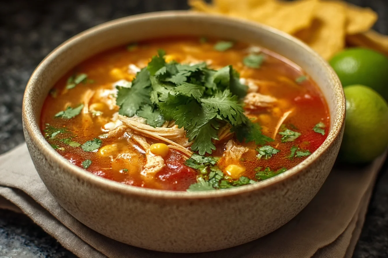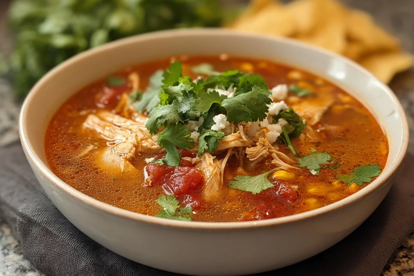 A comforting and flavorful soup combining tender chicken, vibrant spices, and crispy tortilla strips.
