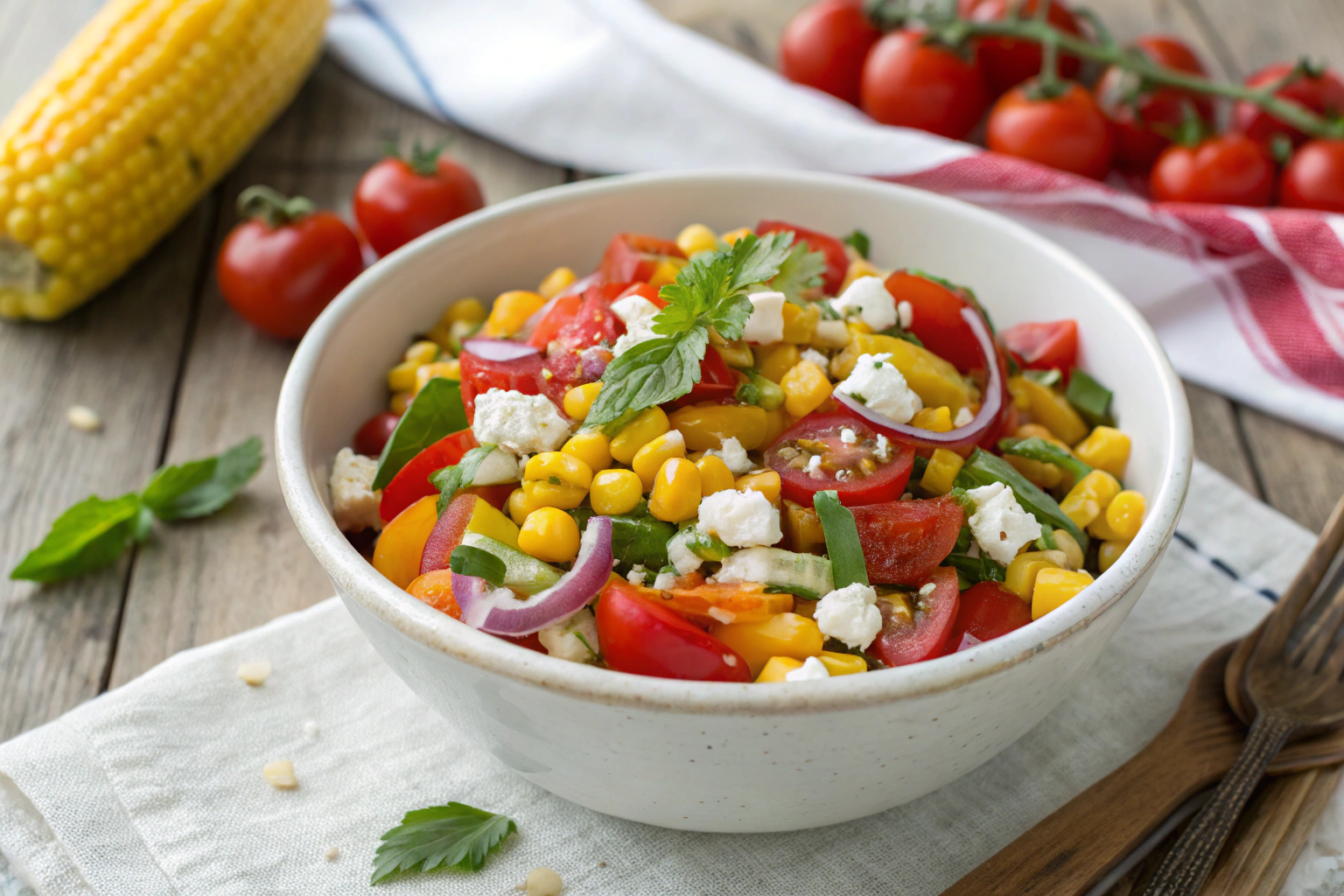 - Combine in a large bowl: Add corn, cherry tomatoes, red onion, bell pepper, and chopped herbs.