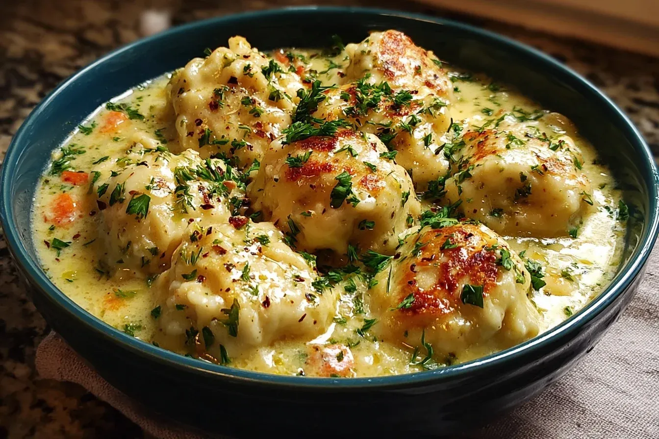 A comforting, creamy dish with tender chicken and fluffy dumplings, perfect for family gatherings.