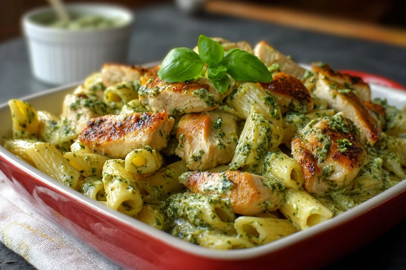 A rich and flavorful pasta dish combining creamy pesto sauce with tender chicken and perfectly cooked pasta.