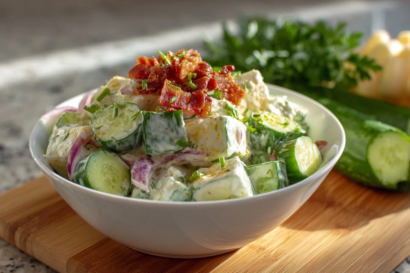 A refreshing and creamy salad combining crisp cucumbers with ranch dressing, perfect for any occasion.