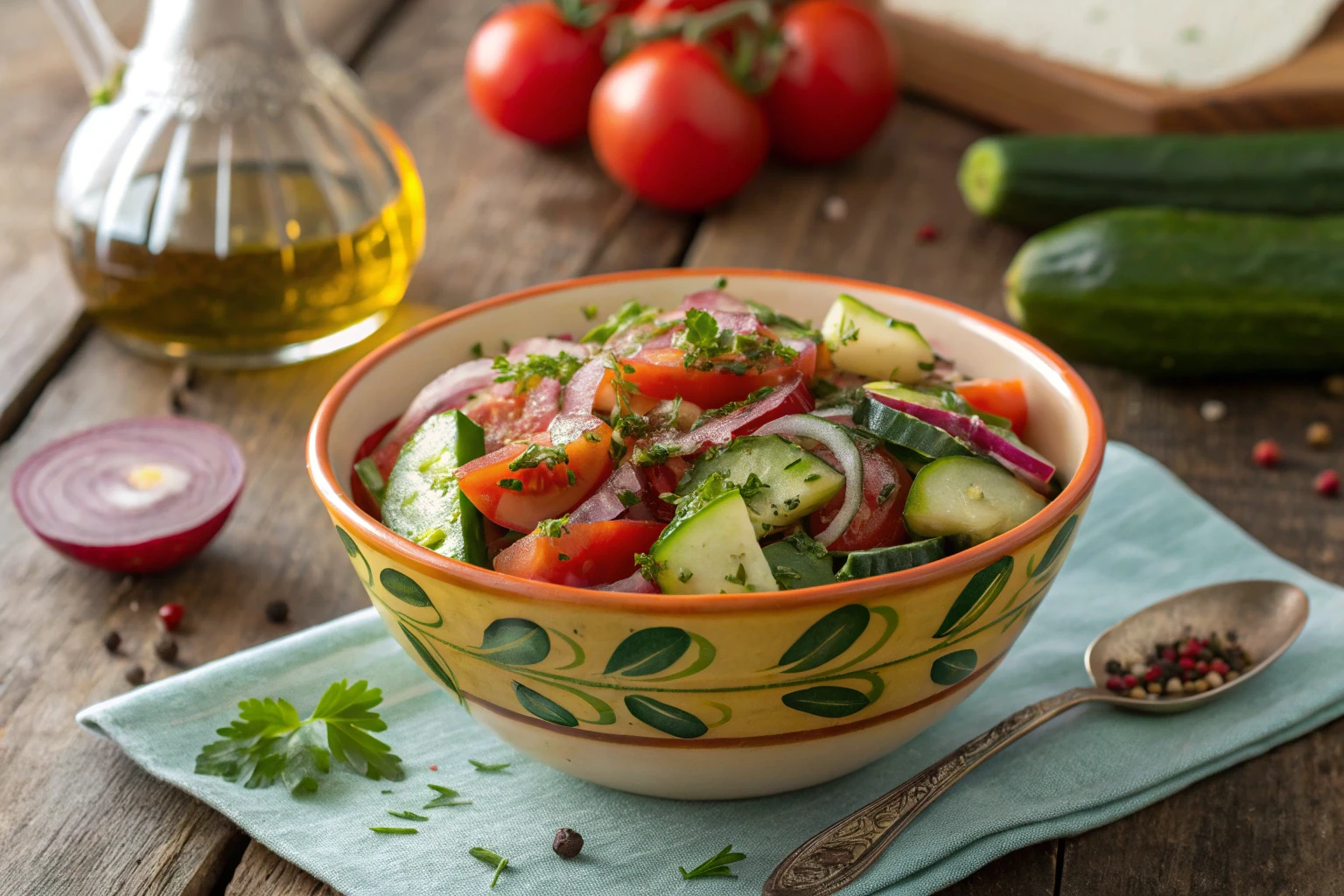 What’s the trick to a salad that tastes amazing every single time? First, salt your cucumbers just a little and let them sit for a few minutes before assembling the salad. This step draws out excess water, keeping your salad crisp and preventing it from getting watery. Drain off any liquid, then add the rest of the ingredients. Second, don’t skip fresh herbs—dill, parsley, or basil add a vibrant, aromatic layer that makes the salad pop.