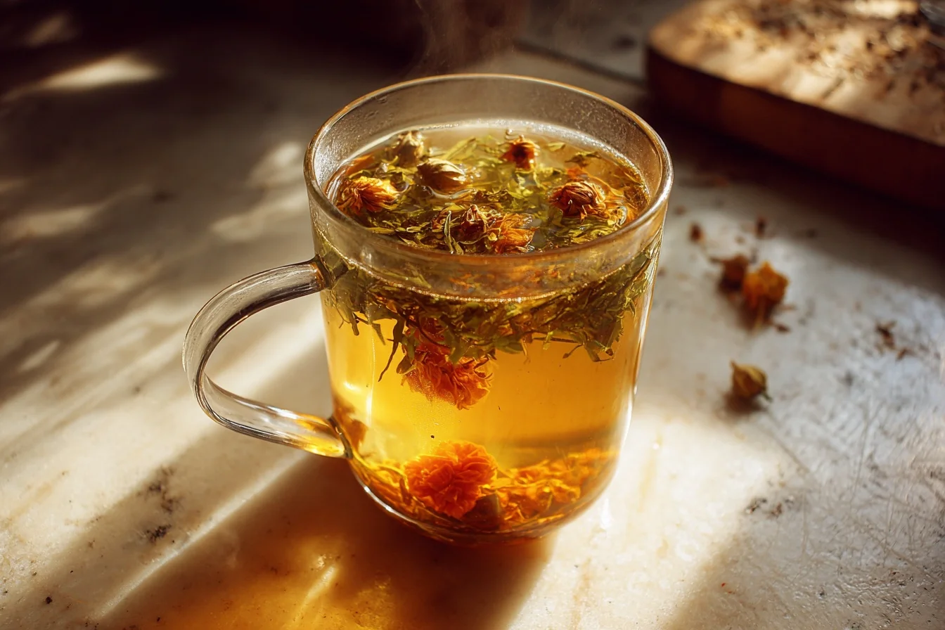 - Strain the tea into cups, using a fine mesh strainer to remove the herbs.