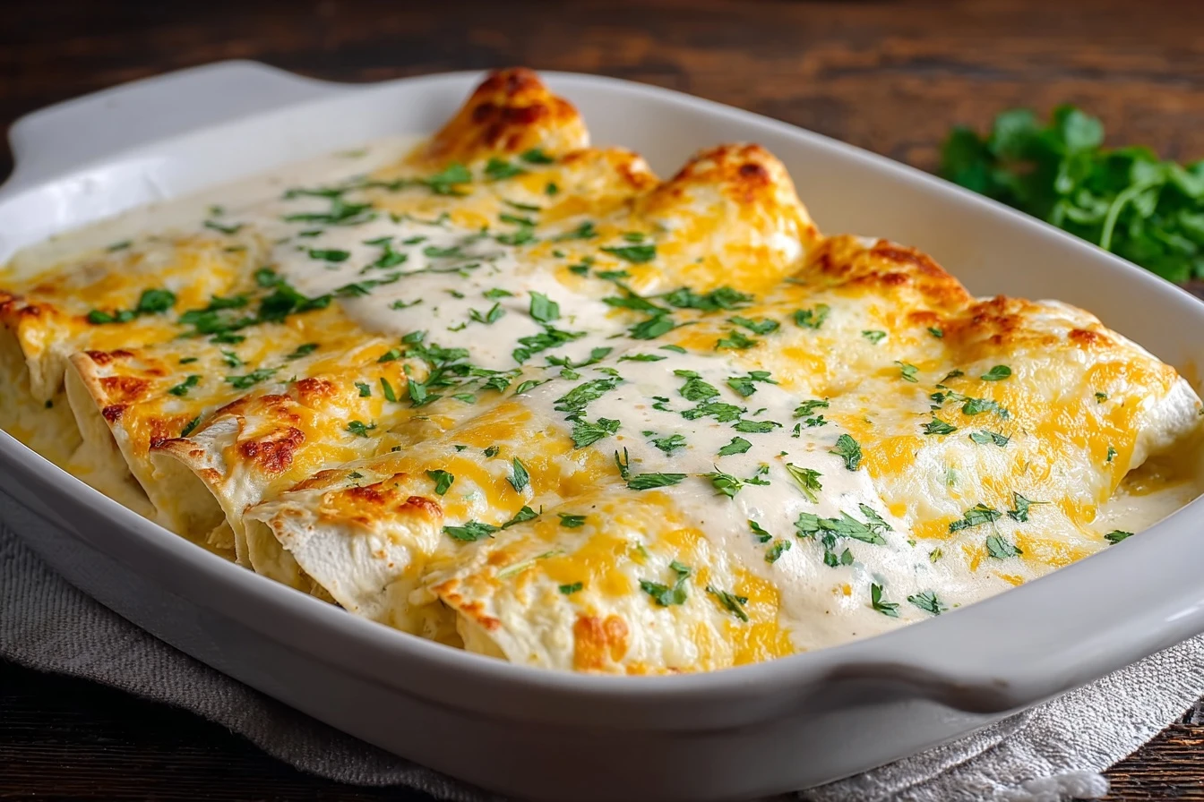Once the white chicken enchiladas are golden and bubbly, remove them from the oven and let them cool slightly. Garnish with fresh cilantro and a dollop of sour cream before serving. These enchiladas pair perfectly with a side salad or Mexican rice.