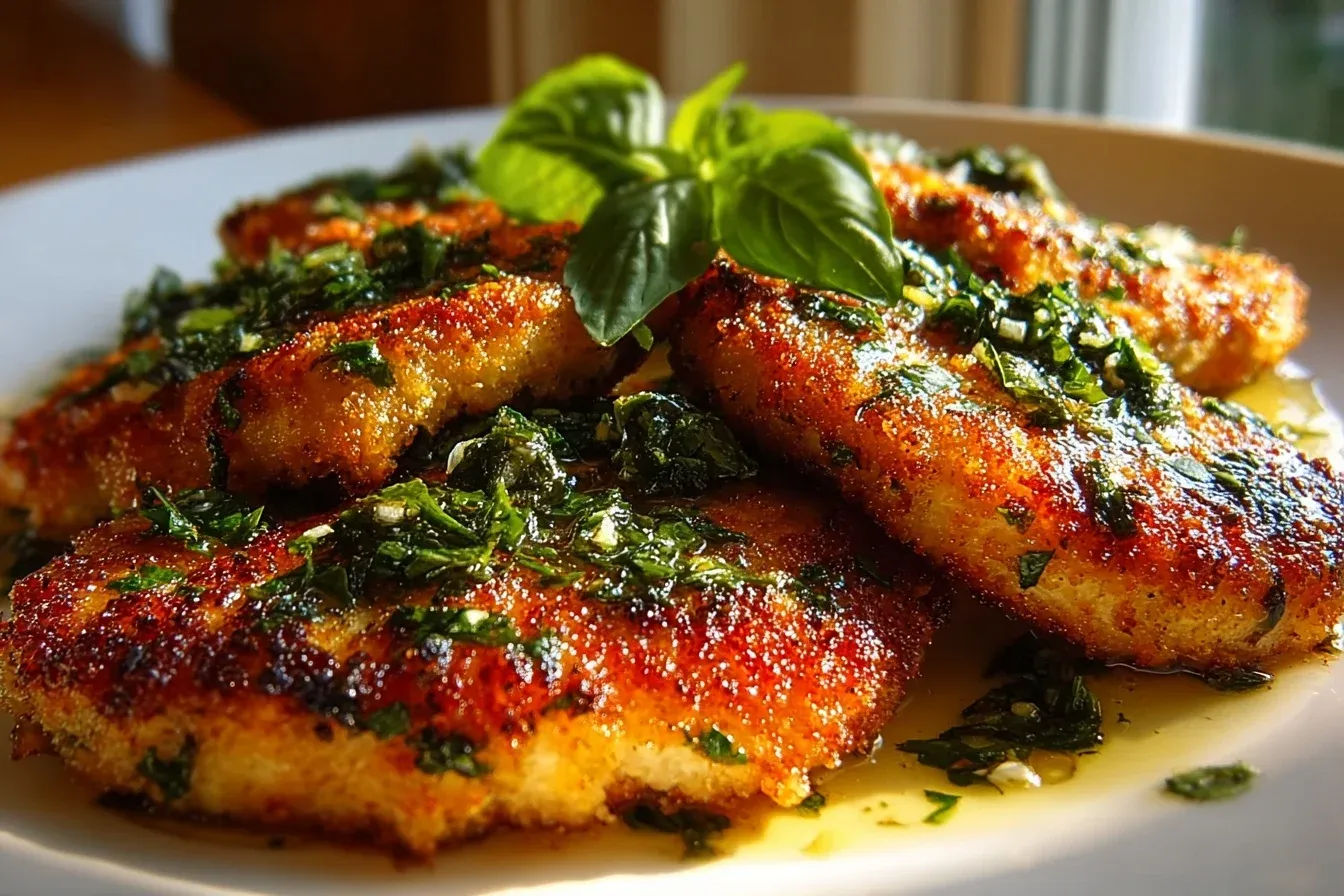 Crispy, golden-brown chicken cutlets infused with fresh basil and garlic, perfect for a comforting family dinner.
