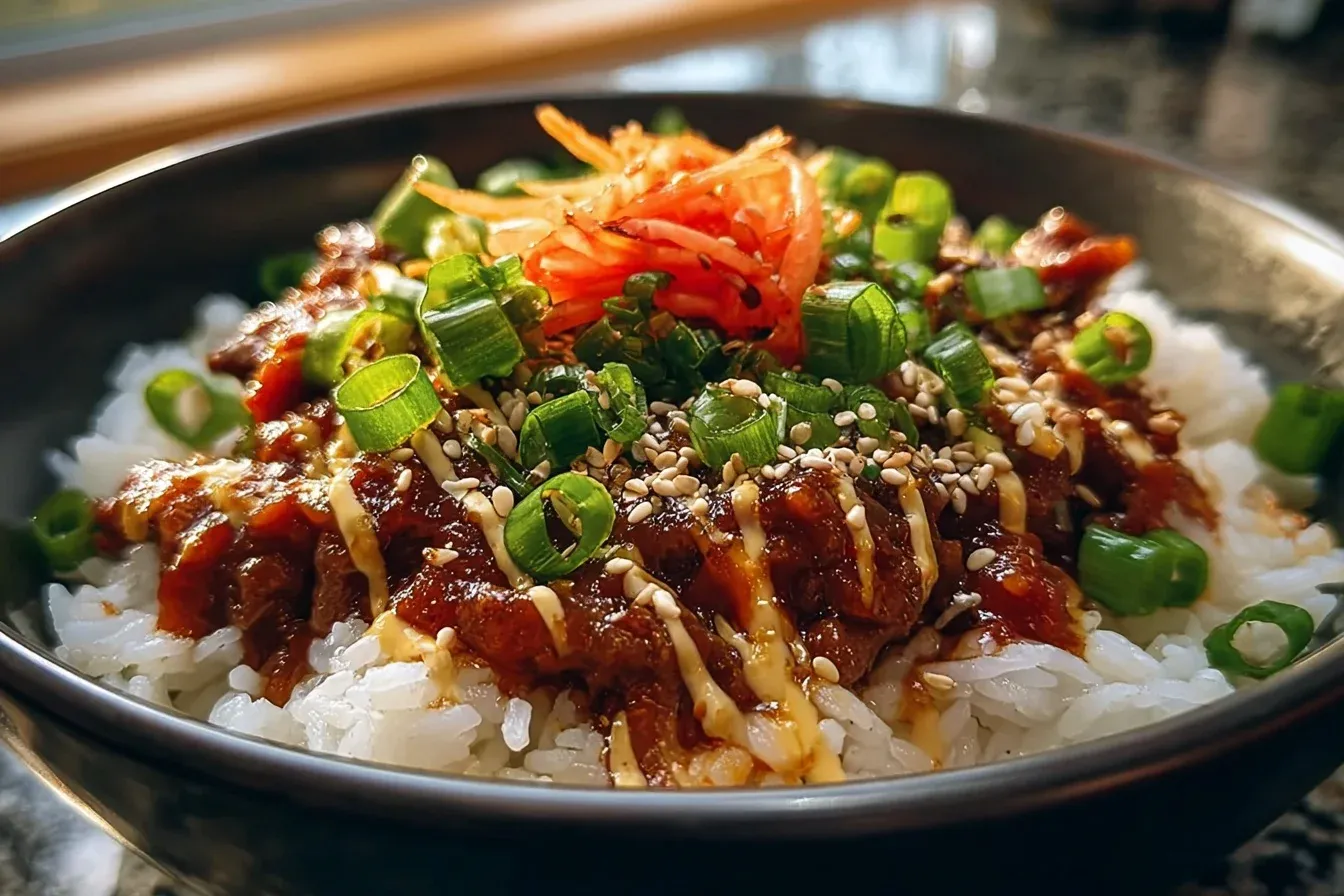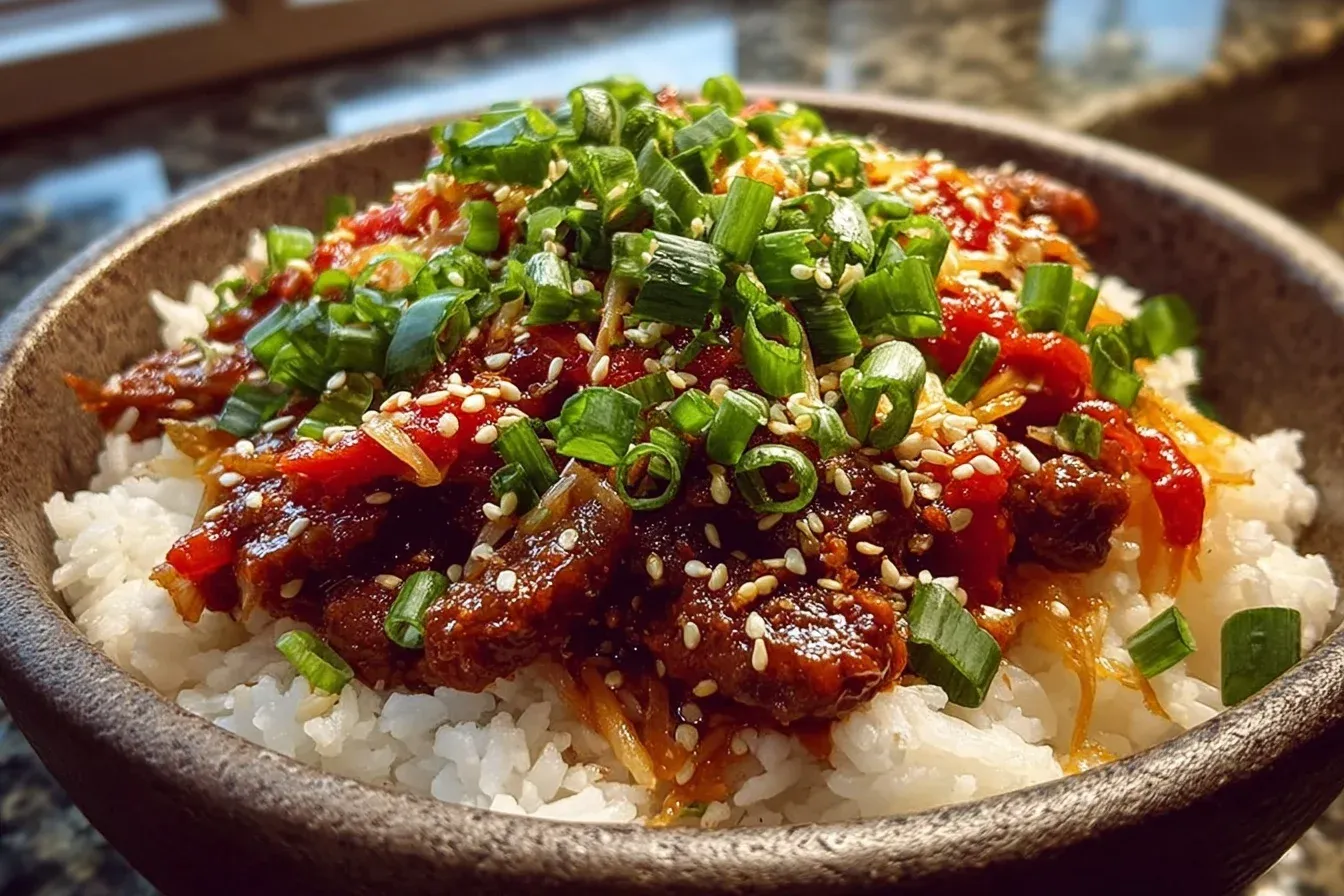 - Serve the spicy beef over a bed of cooked rice, topped with kimchi, sliced green onions, and a sprinkle of sesame seeds.