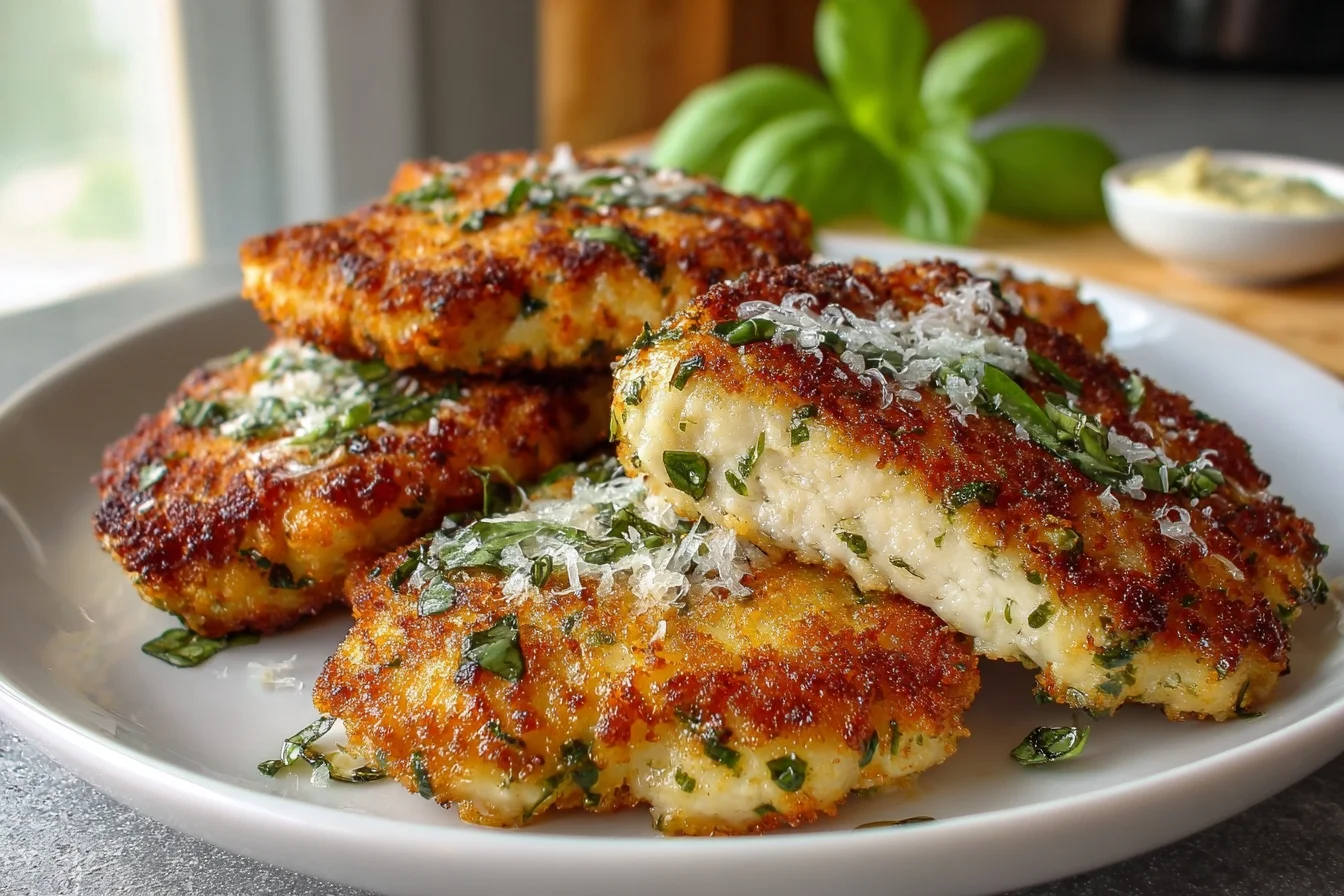 Crispy, golden chicken cutlets infused with parmesan and fresh basil, perfect for a comforting meal.