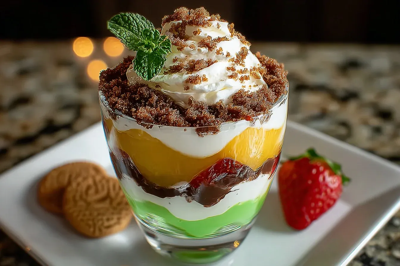 - Layer the Parfait: In a clear glass or parfait cup, start by adding a layer of crushed graham crackers, followed by a layer of green pudding. Add a layer of whipped cream, then a layer of white pudding, another layer of graham crackers, and finally the orange pudding. Top with whipped cream.