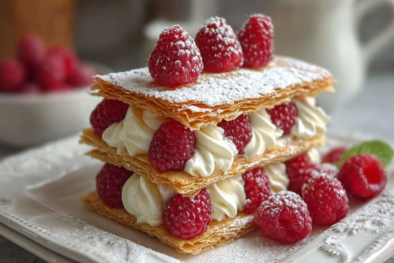 - Spread a generous layer of cream on one piece of pastry, top with raspberries, and place another piece of pastry on top. Repeat until all pastries are assembled.