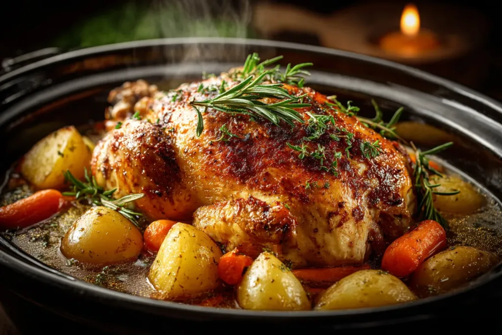 A comforting, fall-apart tender slow cooker chicken infused with garlic, lemon, and herbs—perfect for busy days, cozy nights, or make-ahead family meals.