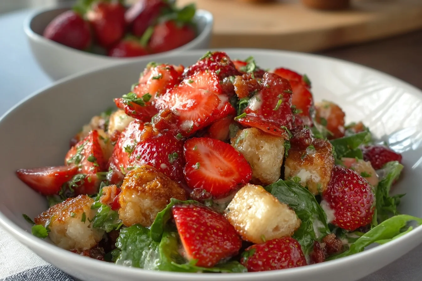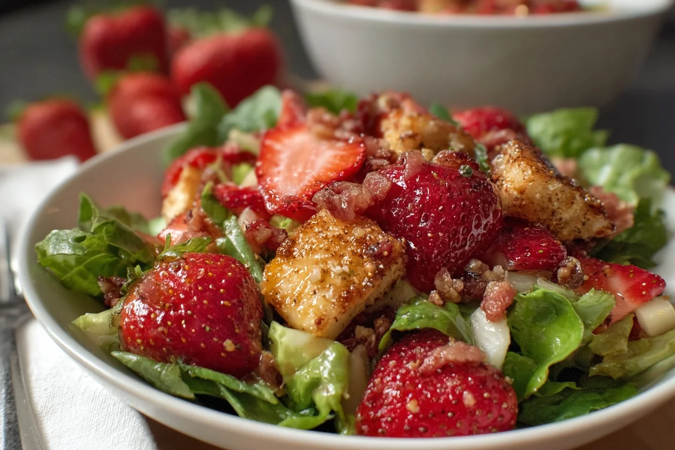 A sweet and crunchy salad featuring fresh strawberries, creamy dressing, and a delightful crunch.