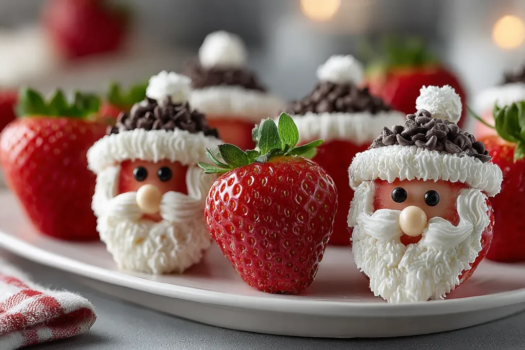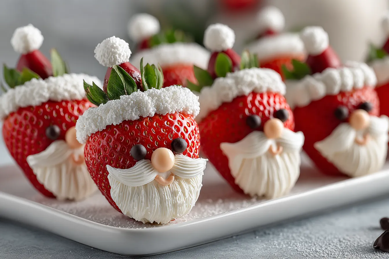 Arrange your Strawberry Santas neatly on a serving platter or tiered tray. Keep them chilled until serving — they’ll stay fresh, adorable, and picture-perfect for hours.