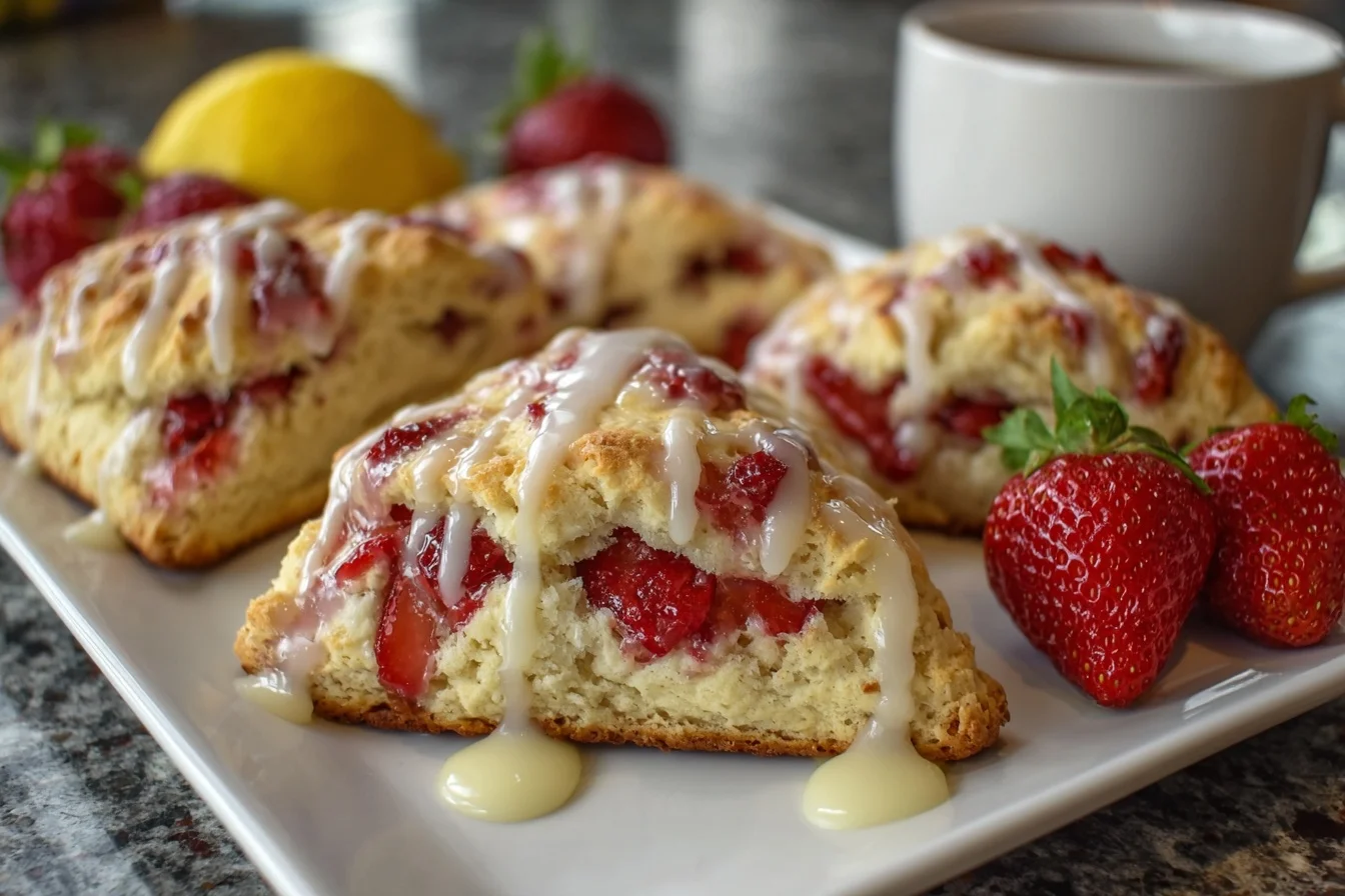 Delicious strawberry scones topped with a tangy lemon glaze, perfect for breakfast or a cozy afternoon snack.