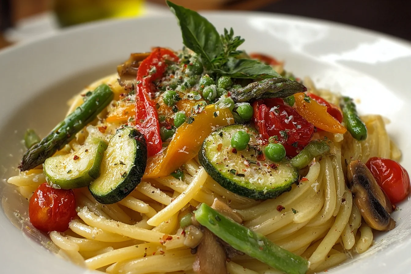 A vibrant and fresh pasta dish packed with seasonal vegetables and a light sauce.